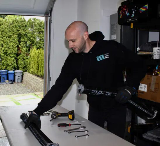 We balance the door, adjust tension, confirm smooth/quiet travel, and verify sensor and safety performance.